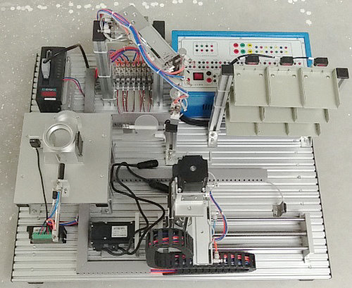 由铝合金导轨式实验台、典型的机电一体化设备的机械部件、PLC模块、变频器模块、步进电机(或伺服电机)模块、按钮模块、电源模块、模拟生产设备实验模块、接线端子排和各种传感器、计算机等组成。同时还要求具有可拓展功能,可以组成更加大型的生产模拟系统,以配合各个学校不同层次,不同专业的教学及培训要求。