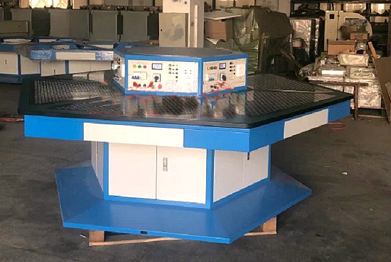 六边形电源控制屏:电源控制屏采用六边形结构,与工作台相对应。框架采用30 R的半圆形铝型材经过专用连接件组装,顶面与底面采用1.2mm厚的优质钢板连接。六个作业面配置有实验电源及主机控制系统,具有漏电保护、短路保护功能。电源控制屏顶面采用10mm厚的铝框包边,内置有直径为770mm的多角度公共操作平台,公共操作平台能360°旋转,能做60°定位,平台顶板采用10mm厚的铝板加工成型,能载重约80Kg的典型工作任务。电源包含六组三相五线制交流电源输出,DC24V直流电源3组,6组网孔板升降调节按钮。